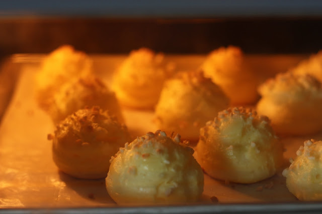 Use a piping bag to pipe out the round shaped on a non stick baking paper. Get some egg yolk and brush it on top of the puff. It's optional to put 1/8 tsp of sugar and 1/8 ground almond onto the puff. Spray some water on the puffs before they go in the oven.